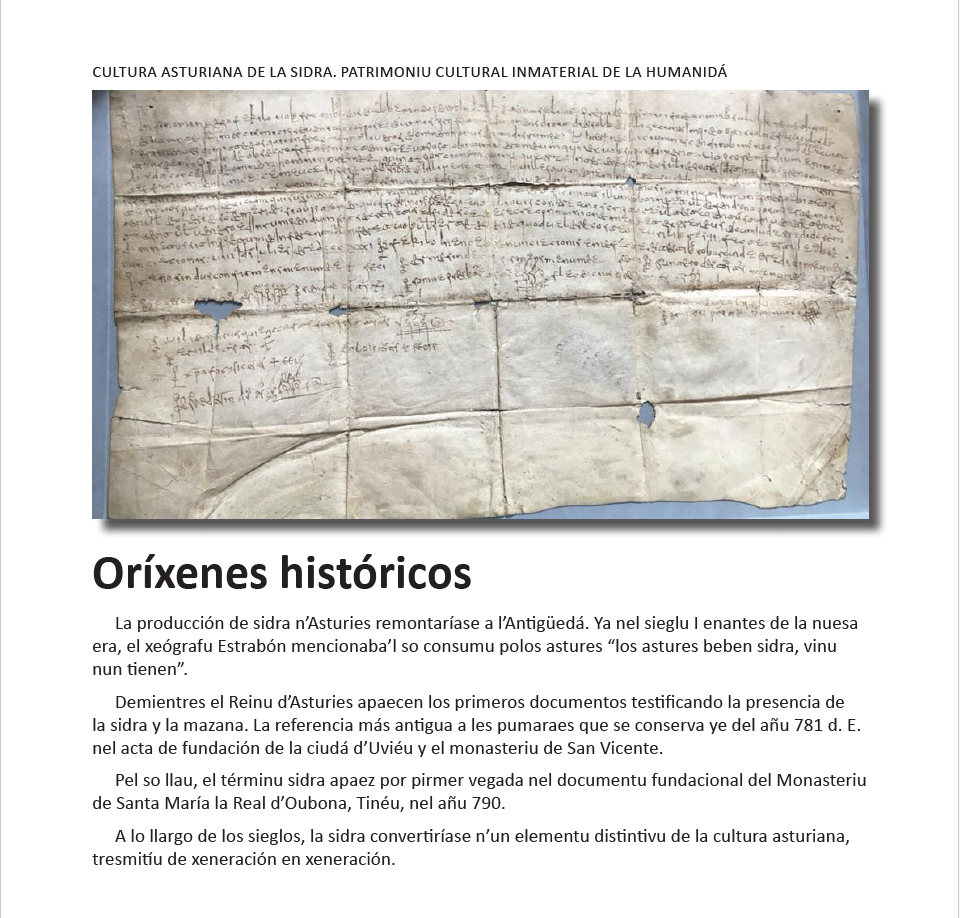 La publicación, titulada ¿Qué ye la cultura asturiana de la sidra?, tien como oxetivu ufiertar una visión clara y accesible de los elementos que conformen esti padremuñu: la producción de la sidra, los llagares, les pomarades, l’escanciáu, les sidreríes, la comunidá y la tresmisión de saberes que s’axunten alredor d’esta tradición secular.