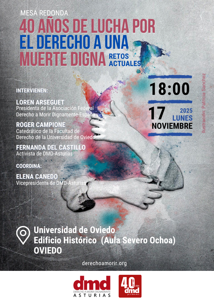 L’Asociación Drechu a Morrer Dignamente convoca la mesa redonda “40 años de llucha pol drechu a una muerte digna. Retos actuales”, que va celebrase’l llunes 17 de payares a les 18.00 hores na Universidá d’Uviéu (Edificiu Históricu, aula Severo Ochoa).