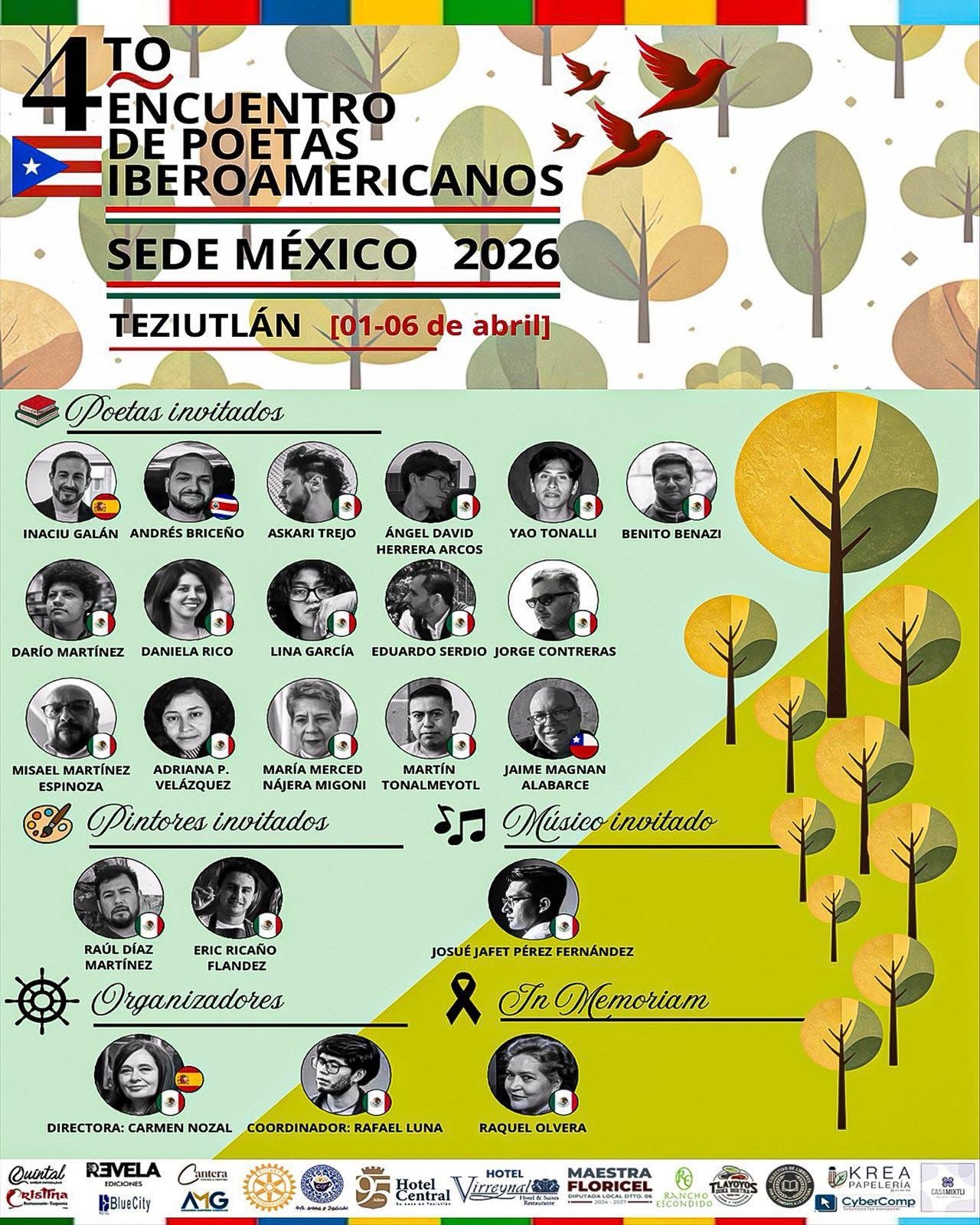 Xunto al poeta asturianu ta prevista la presencia d’autores como Sergio Briceño (Costa Rica), Jaime Ignacio Magnan Alabarce (Chile), Askari Martre, Angel Herrera, Yao Tonalli, Benito Benazi, Daniela Rico Straffon, Lina García, Eduardo Serdio, Jorge Contreras Herrera, Misael Martínez, Adriana P Velázquez, María Merced Nájera Migoni y Martín Tonalmeyotl (Méxicu).